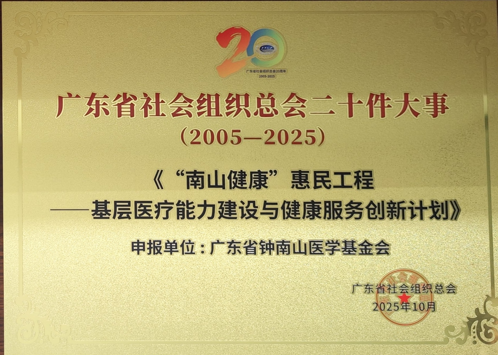 “南山健康”惠民工程——基层医疗能力建设与健康服务创新计划获评为广东省社会组织总会二十件大事(2005-2025)